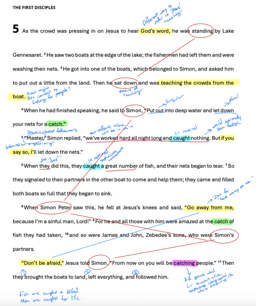 Finally, if you REALLY want to try to notice things about a particular passage, consider printing it out and marking it up. You can do this however you want, but writing, highlighting, etc. can be great ways to slow down and really notice what’s going on. I like to do this on my iPad with an Apple Pencil. Here’s a recent one I did for Luke 5: